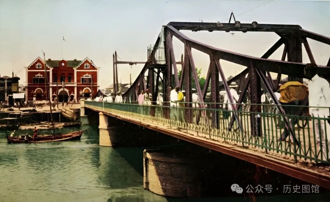 金刚连接河海两岸,桥面上人来人往,桥头有一座欧式建筑。1924年,在桥下游新建起一座金刚桥,老金刚桥成为了一座便桥。