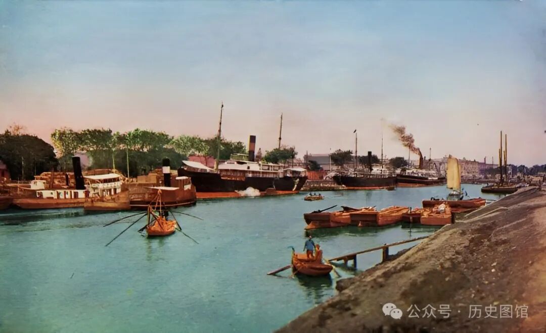 这是民国时期,位于天津英租界的白河。他们开始对白河进行详实的测绘规划,并对码头进行了改造。随着租界地的扩张,城市格局发生改变。白河先后进行了六次裁弯取直,位于白河两岸的码头有几百座。