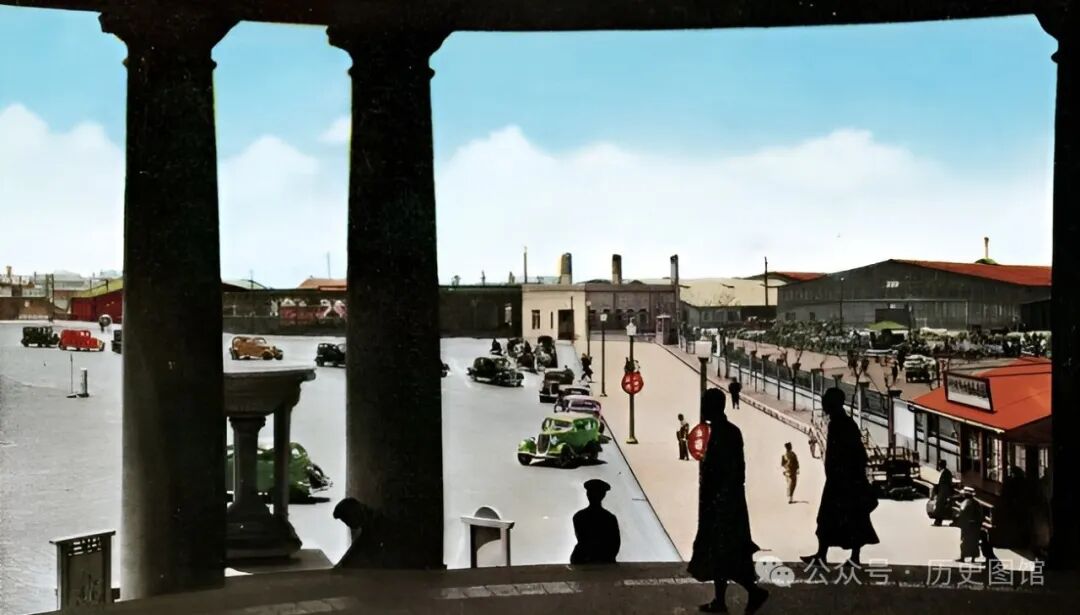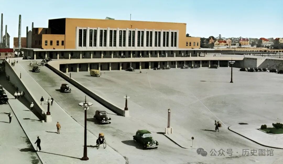 照片中是一座火车站,旧址位于今中山区长江路。日本占领大连时期,由满铁主持修建,始建于1936年,被称为“大连驿”。大连驿是当时亚洲最大的火车站。