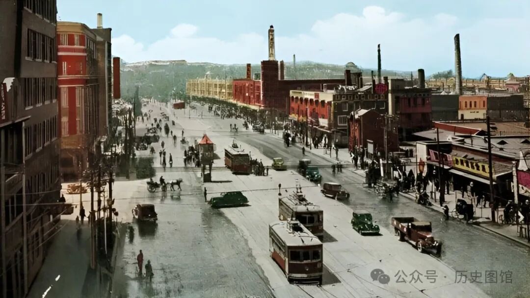 上世纪20年代,有旅馆街之称的大连伊势町。街道宽阔笔直,一眼望不到尽头。街道两侧大楼林立,街上车水马龙。