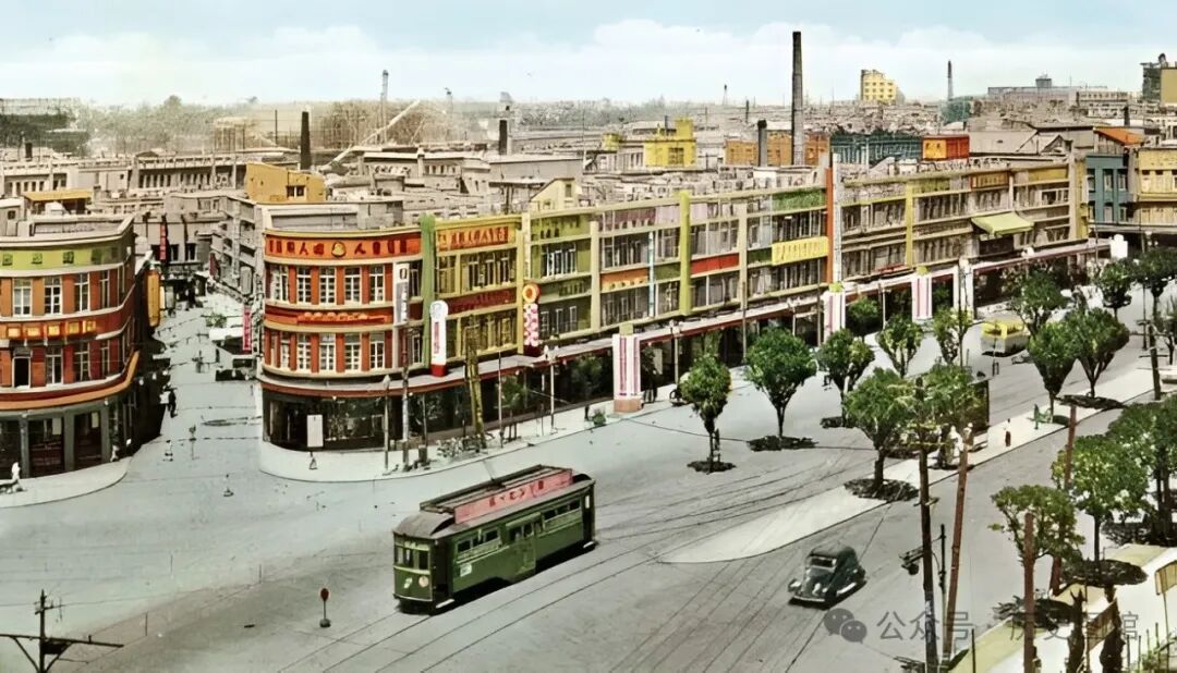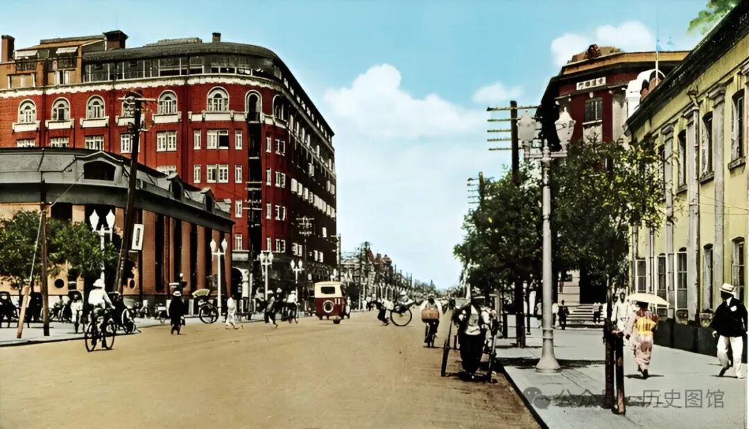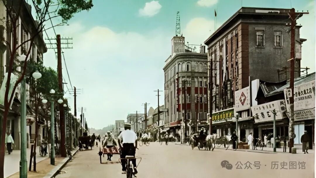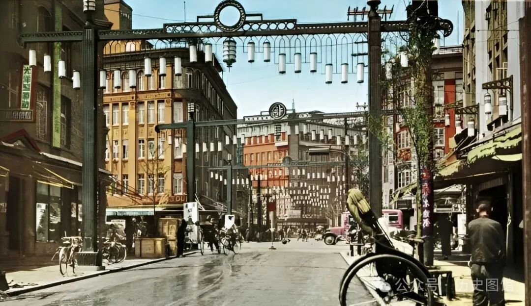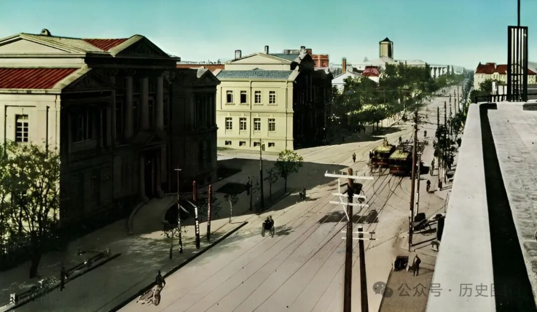在当时的大连,日本人集中居住地,一般用“通”、“町”、“台”等做街道名。照片中这条街道叫“浪速通”,即现在的中山路。过去的中山路已经相当繁华。