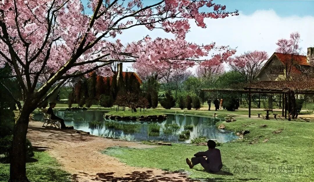 这是位于大连星星浦的一处公园。公园里环境不错,有绿地和池塘,岸边盛开的粉色花是樱花。一名男子坐在池塘边的草地上休息。
