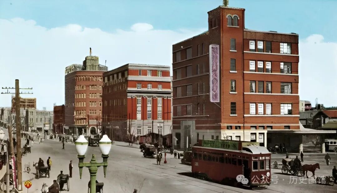 这张照片,拍摄于大连常盘桥附近繁华的街道。常盘桥,位于今天的商步行街和青泥洼街处,现在的名字叫青泥洼桥。街道上能看到有轨电车、马车还有黄包车。