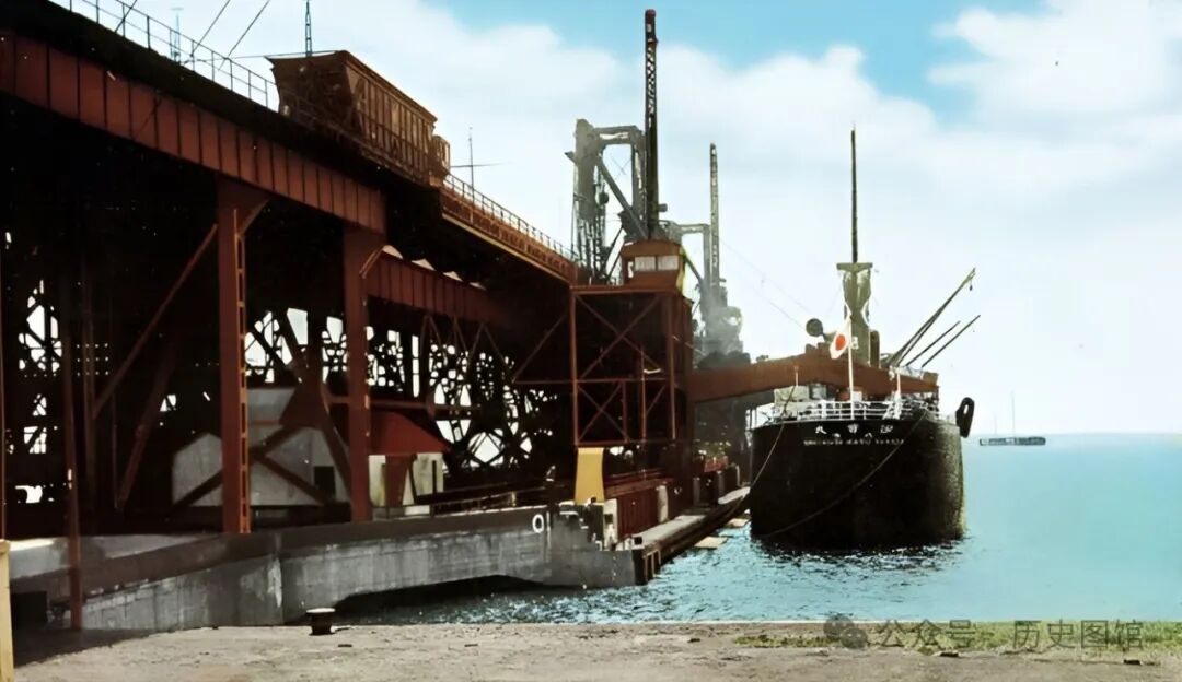 这张照片,拍摄于大连甘井子煤炭埠头。甘井子煤炭埠头,又称甘井子第一埠头,始建于1926年。主要包括防波堤、高架煤栈桥、贮煤场等。这座当时东亚最大的煤炭专用码头,以机械化作业而远近闻名。
