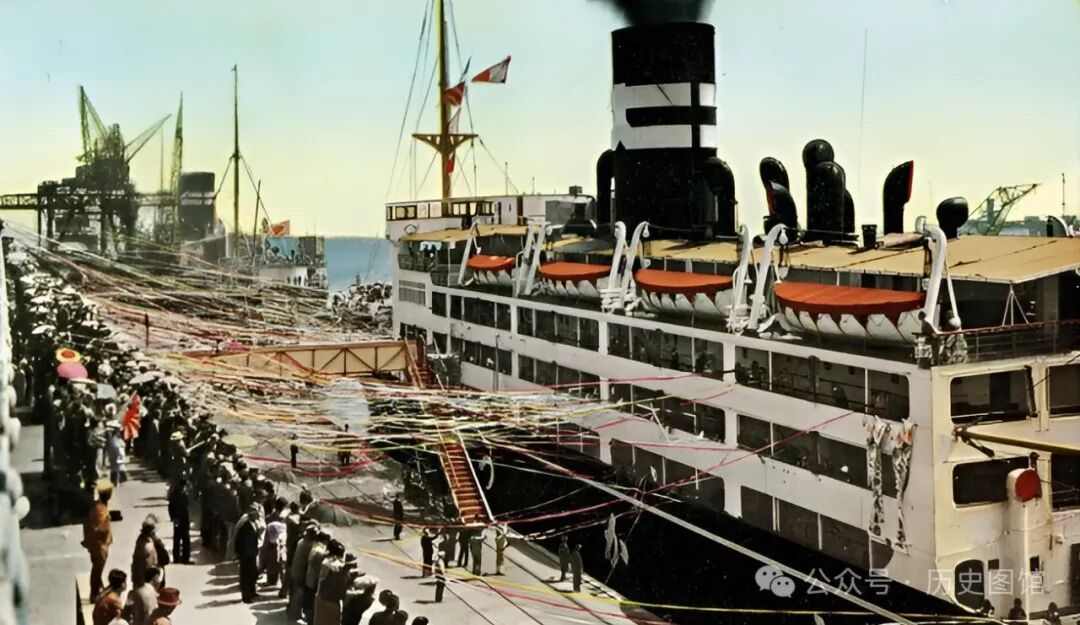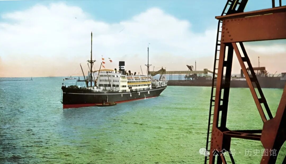 上世纪20年代,大连港码头上,一艘新式大型邮轮下水试航。现场旌旗招展,船身系满彩带,码头有不少人参加下水仪式。