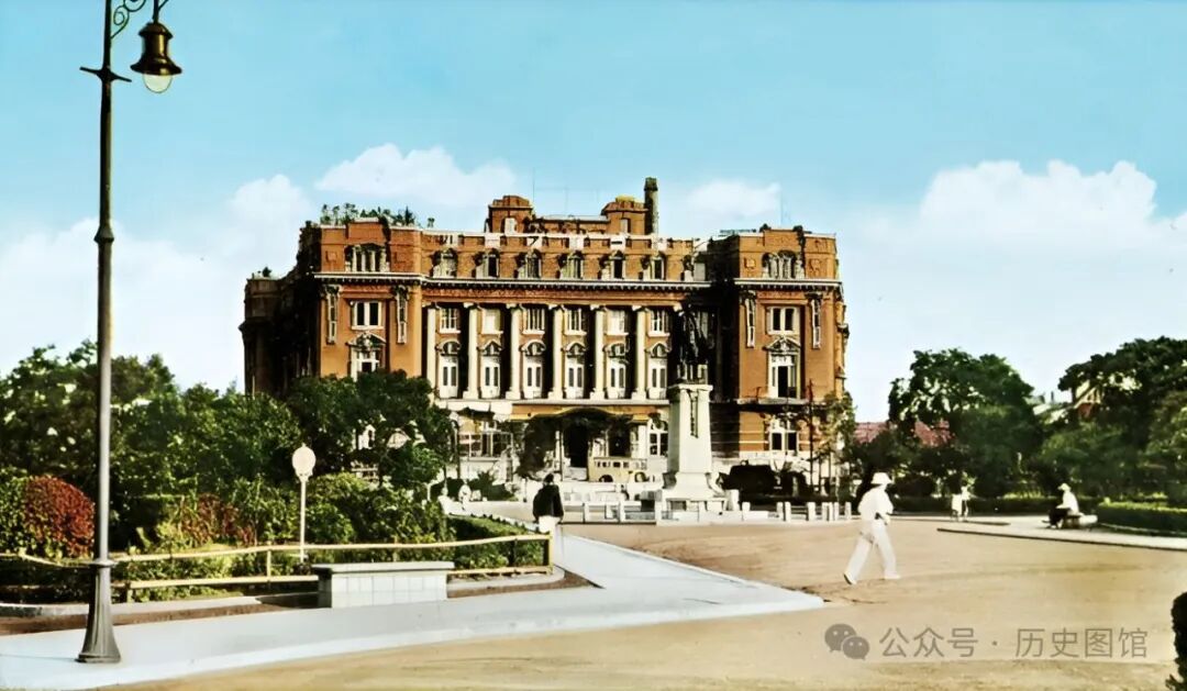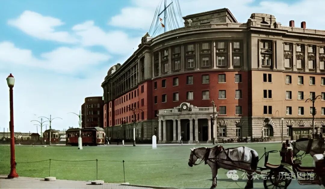 照片中左侧最近的一栋建筑,是满铁本社所在地,建筑三层,地下一层,旧址位于今大连市中山区鲁迅路。满铁本社,是日本在中国大连设立的对满洲进行殖民的机构,简称满铁。
