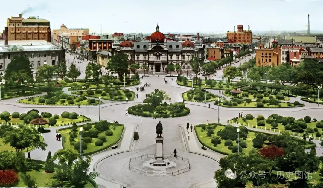 上图里的城市广场,就是著名的大连中山广场。广场设计采用欧式风格,街道呈圆形辐射状分布四周矗立着罗马式、哥特式建筑。照片拍摄于1929年。
