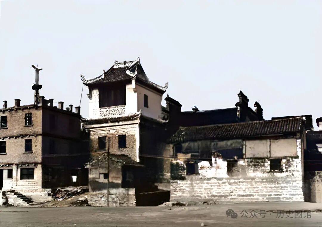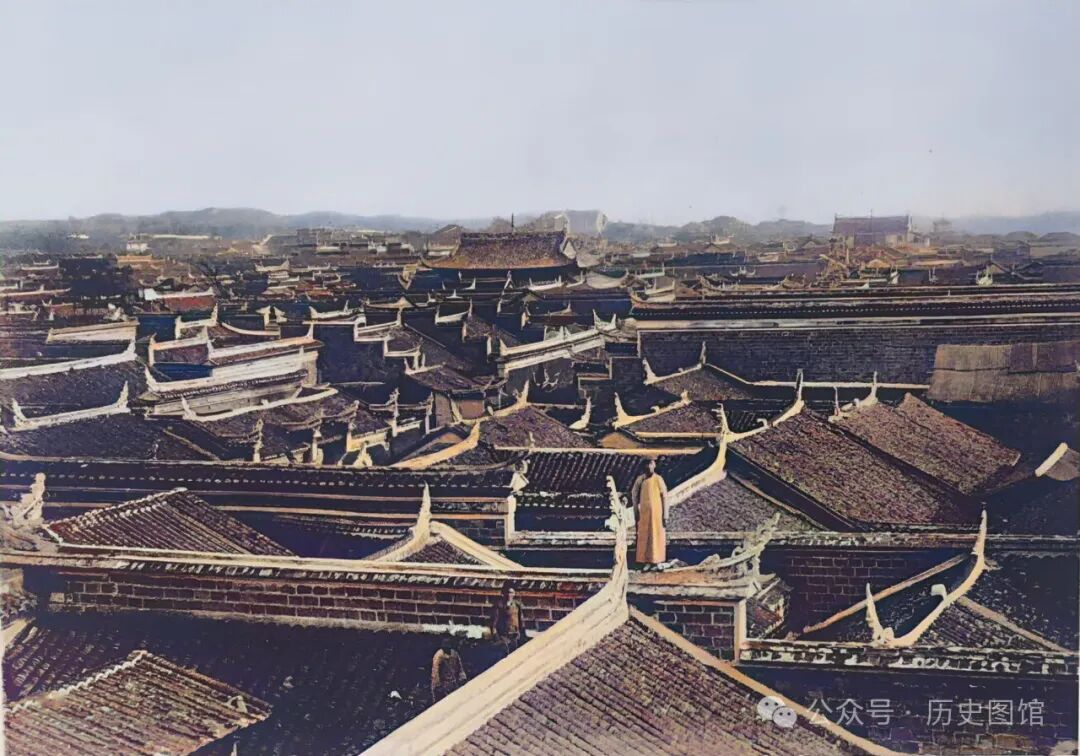 民国时期,站在高处俯瞰宜昌城。城内建筑鳞次栉比,远处有高大的殿宇和城楼。一名男子站在墙头上,画面顿时活跃起来。