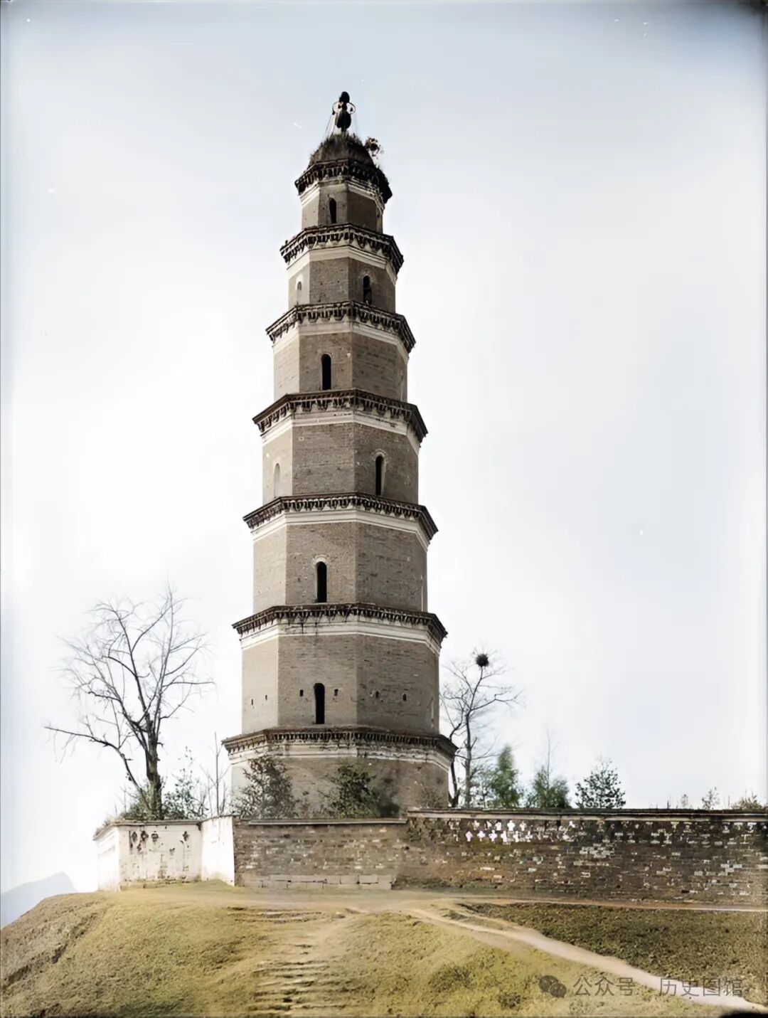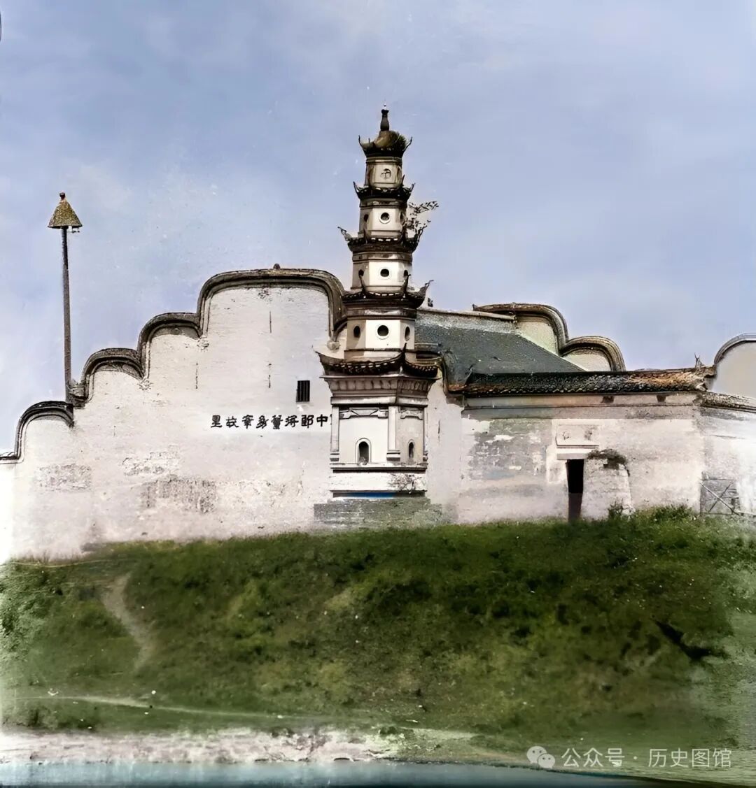 民国时期的宜昌水府庙,墙壁上写着“中郎将董幼宰故里”,建筑前面有一座五层宝塔。