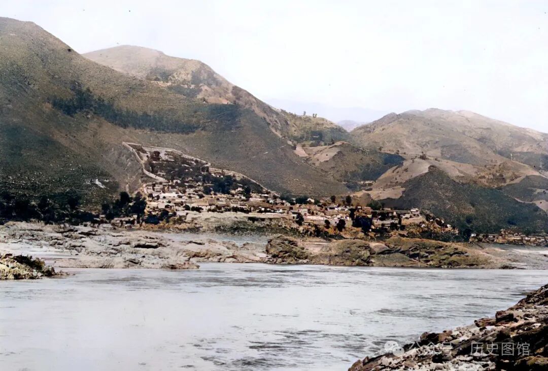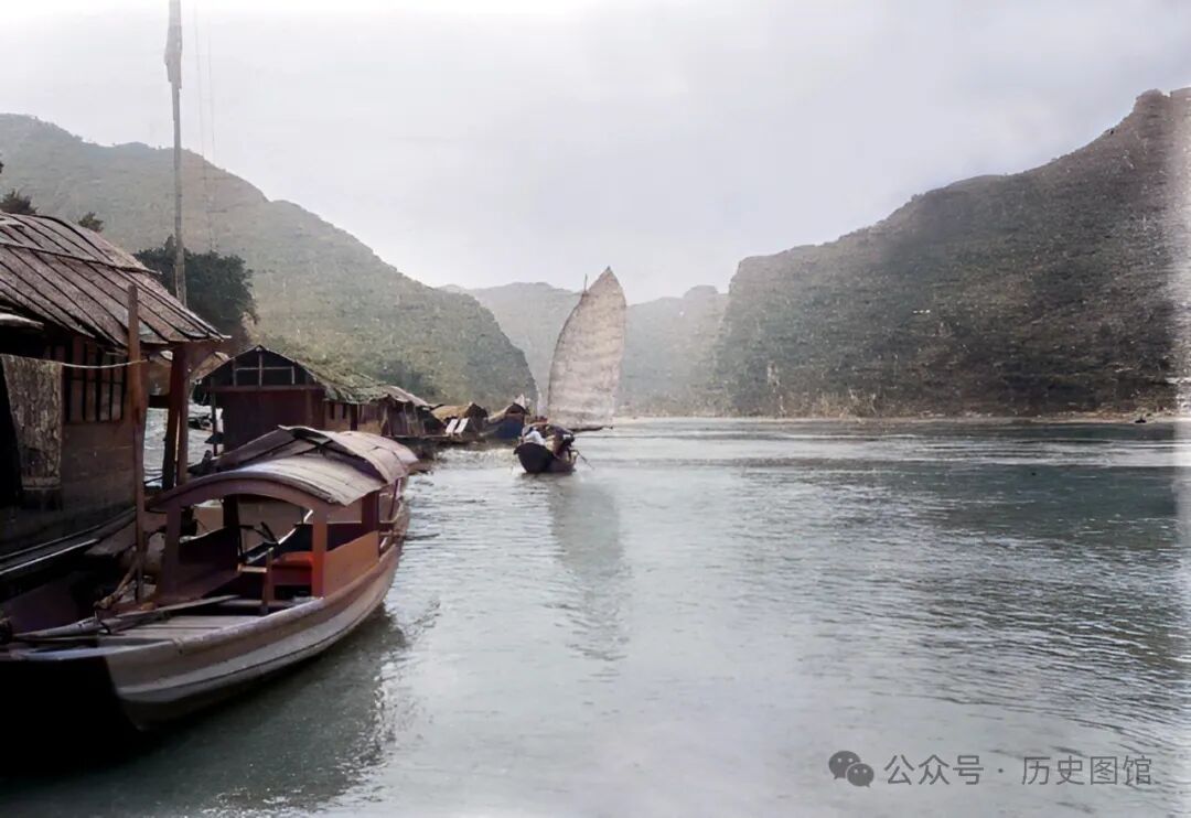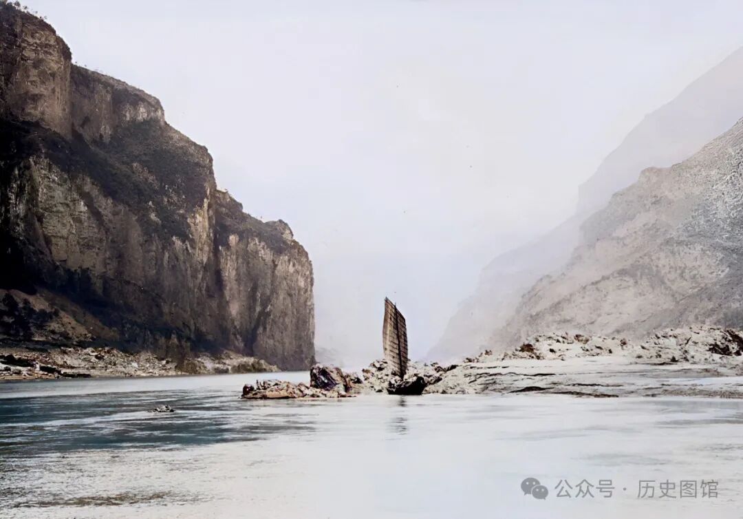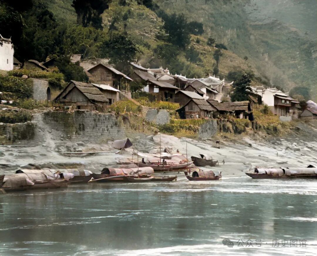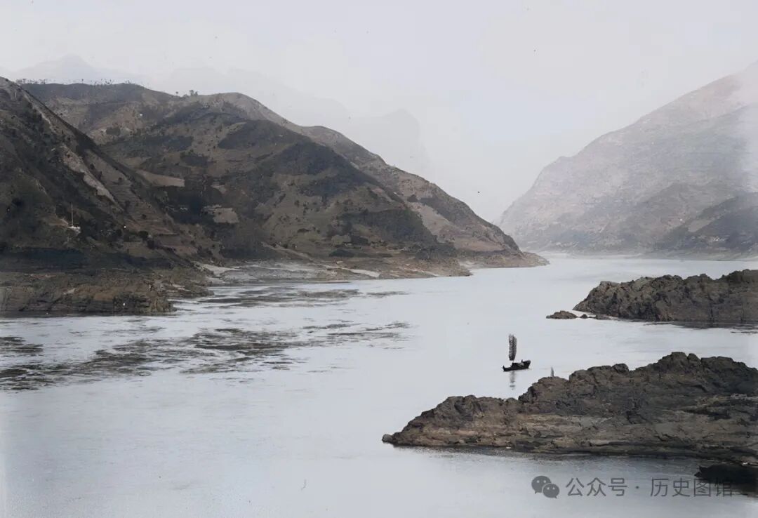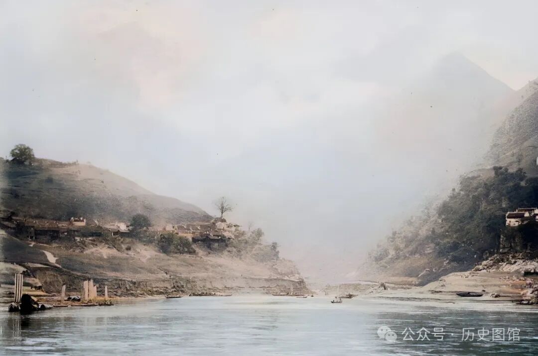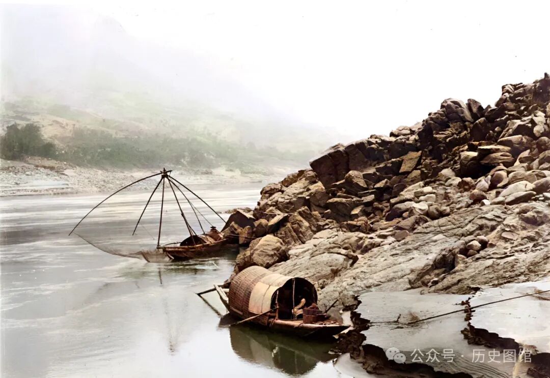 这张照片中,拍摄于黄牛峡附近。江水湍急,岸边乱石堆叠,一艘小船停靠在江边,不远处,当地人撑起的渔网清晰可见。民国时期的黄牛峡,峡江风貌令人赞叹。
