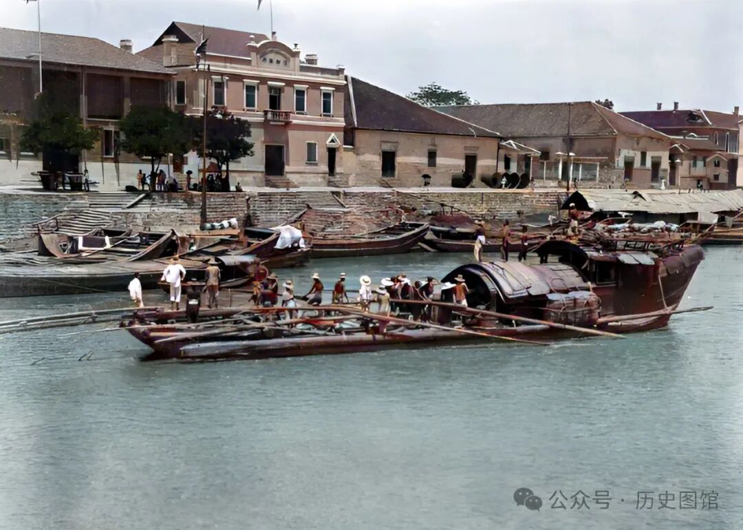 宜昌江边码头景象。岸上有一座欧式建筑,是当时的“怡和洋行”,房顶上挂着英国国旗。
