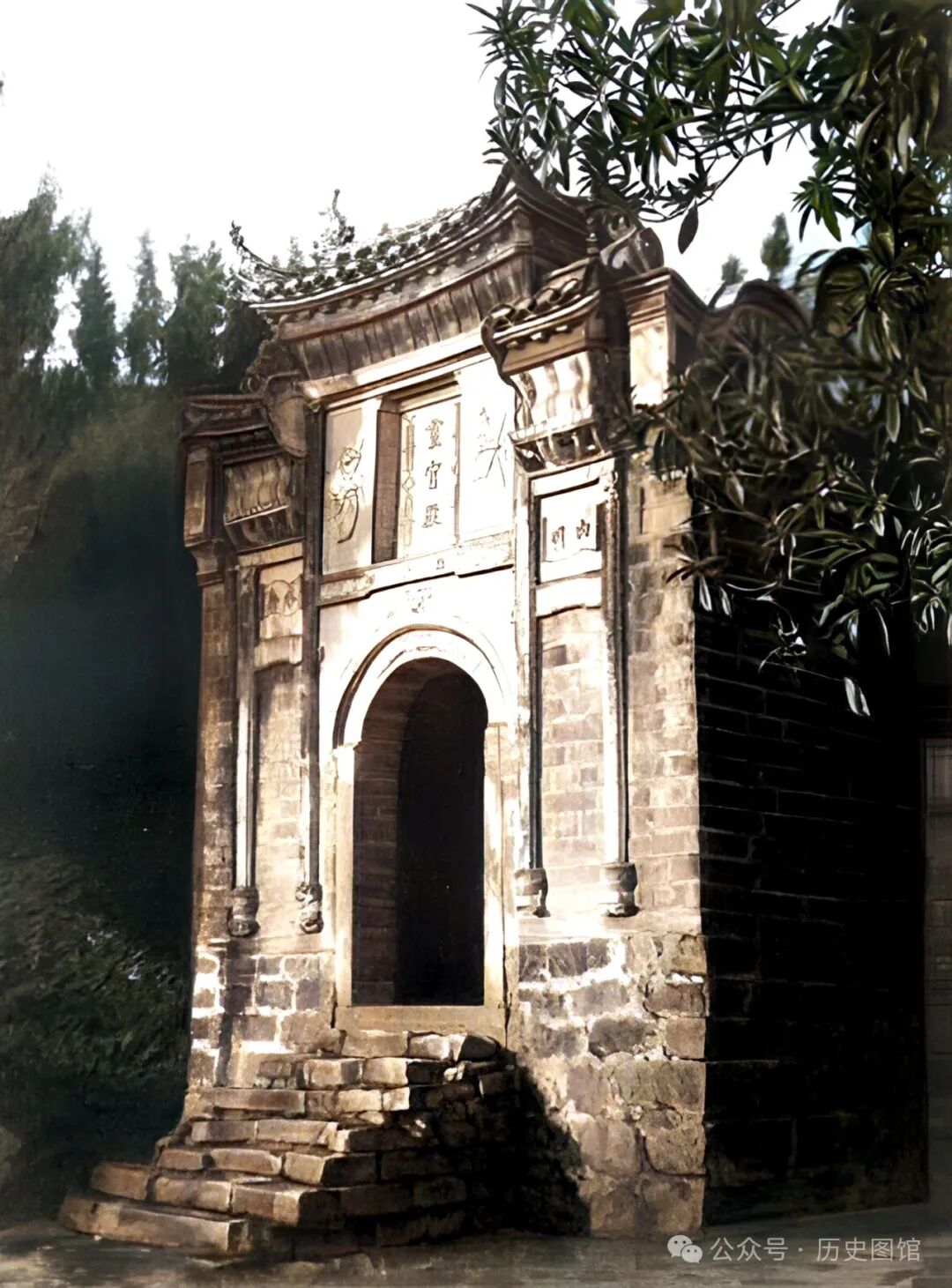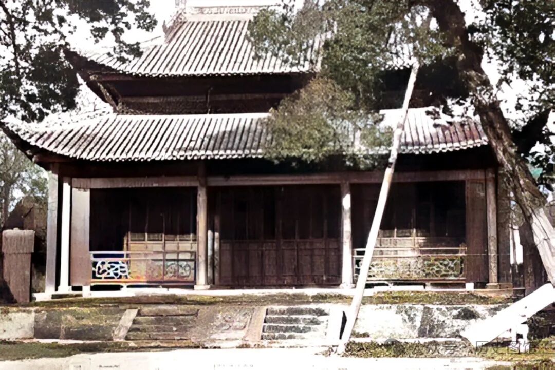 民国时期,湖北宜昌文庙内景象。照片中这座大殿,面阔三间,飞檐高挑,巍峨壮观。大殿前有一棵倾斜的柏树,用木棍支撑。有宜昌当地人回忆,大成殿在60年代被拆除,殿侧的庑房后来也被拆掉。