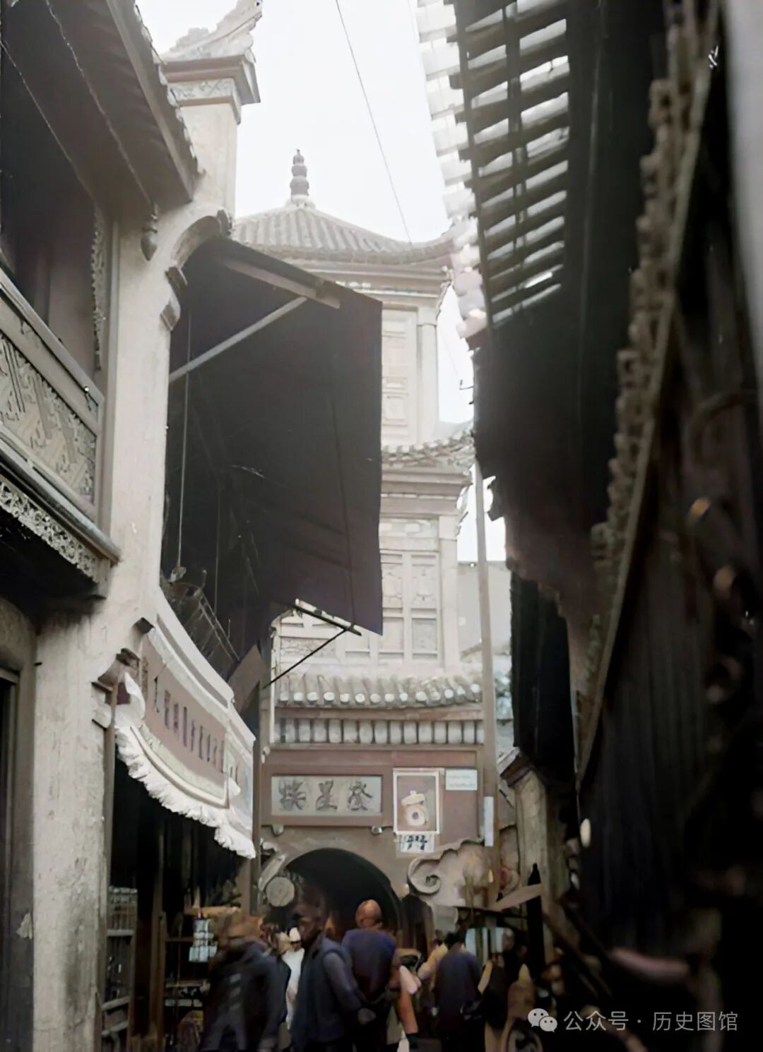 民国时期,位于宜昌城内的魁星楼。魁星楼高三层,跨街建造,街上人来人往。
