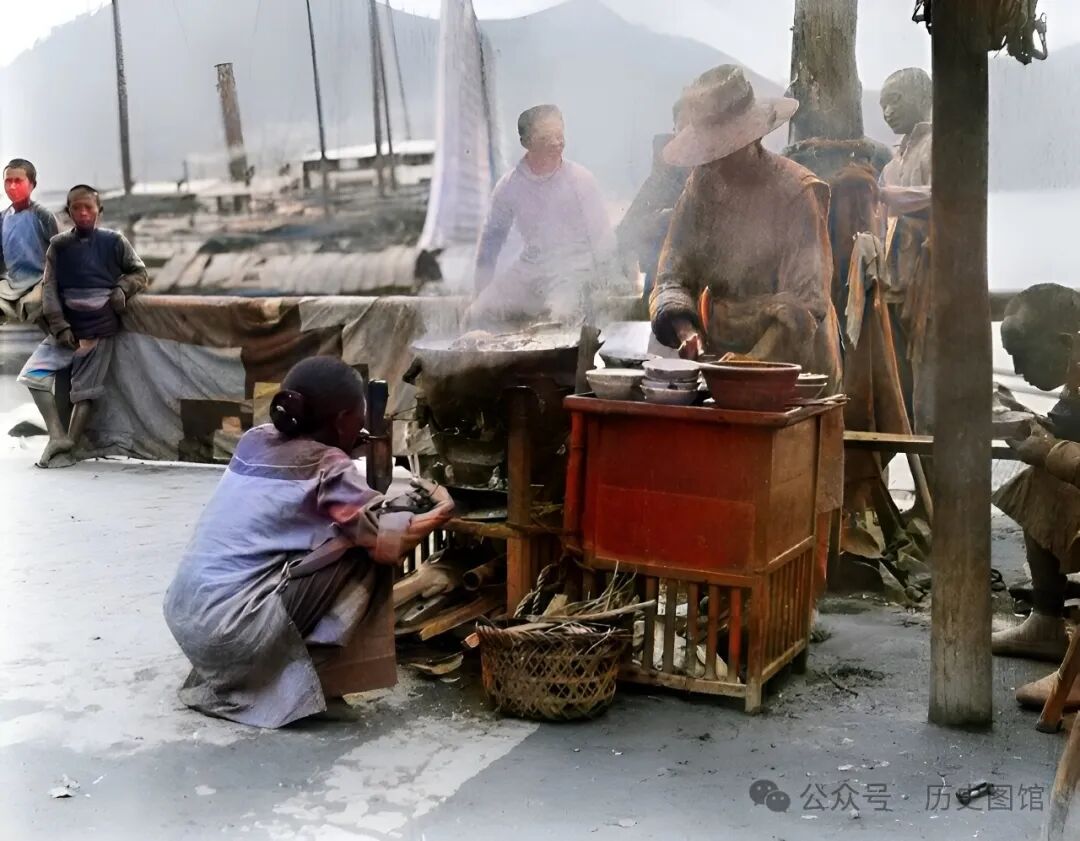 民国时期湖北宜昌,码头边上有一个小吃摊。摊主是一对夫妻,他们配合默契,正在为码头上的工人做饭。锅中冒起热汽。