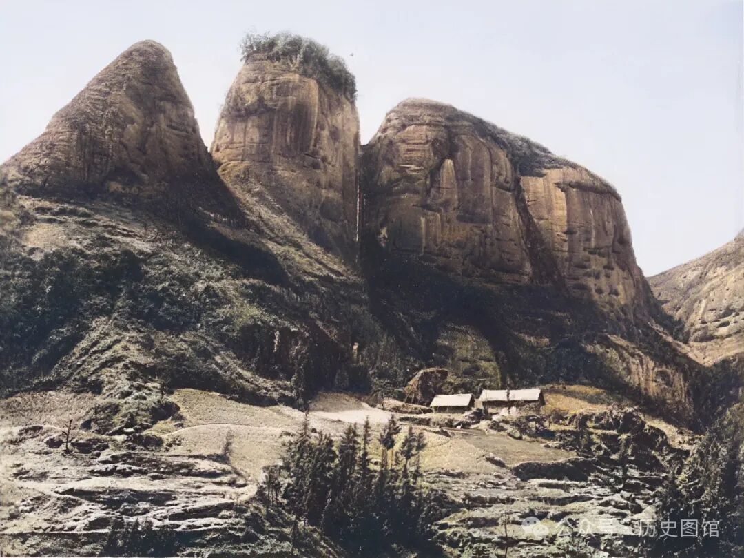 这是位于石门洞对面的笔架山,远看商形犹如一座巨大的如笔架,因此得名笔架山。山岩底部,竟然居住着一户人家,几栋房屋民舍清晰可见。如此境地,堪称绝佳的隐居之所。