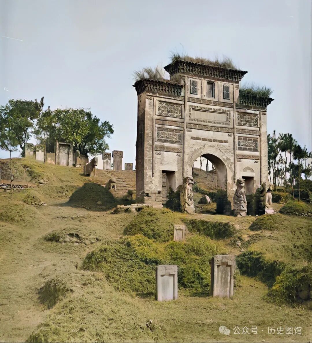 这是一处陵墓,是宜昌镇总兵张忠孝的墓园。一座高大的三间四柱砖砌牌坊,看上去非常古朴。牌坊前矗立着几尊石狮子。穿过牌坊,后面的高地上矗立着很多石碑。
