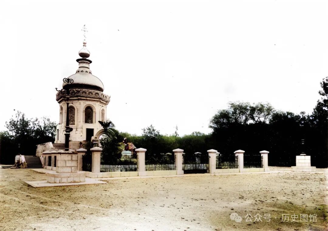 照片中矗立着一座西式建筑,这其实是俄国人建造的一座纪念碑,有原型的穹顶,四周还建有围栏。该纪念碑位于白河边上。