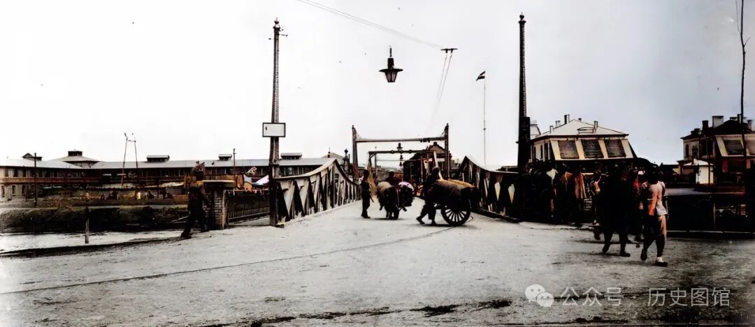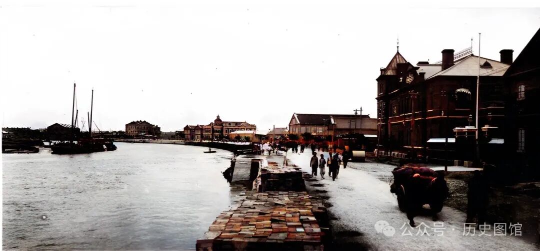 这张照片,拍摄于天津日本居留地,画面中的河流是白河。岸边矗立着很多西式建筑。河堤上是一条繁忙的大路。