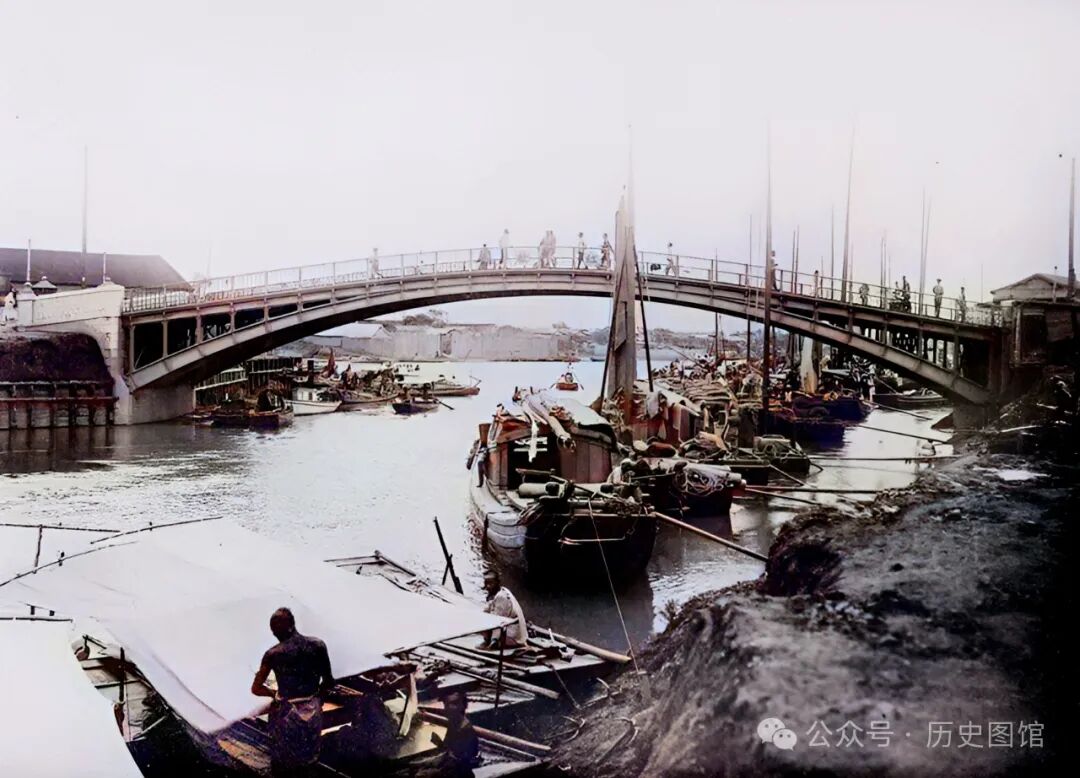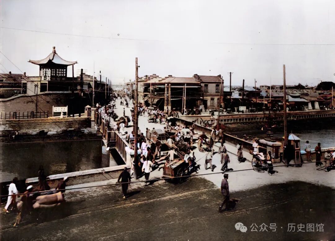 这是位于天津北运河和子牙河交汇处的大红桥。该桥原来是木桥,1888年改建为铁桥。1924年,被洪水冲塌。为了便于通行,人们又在原址建起一座浮桥。1936年,才重修了新的大红桥。天津红桥区就是以该桥命名的。