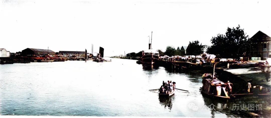 这是天津白河英租界河段景象。河道很宽,有大型船只停靠在码头上。清朝时期,在一些官方文书上,把海河叫做“白河”。白河,其实就是现在的海河。