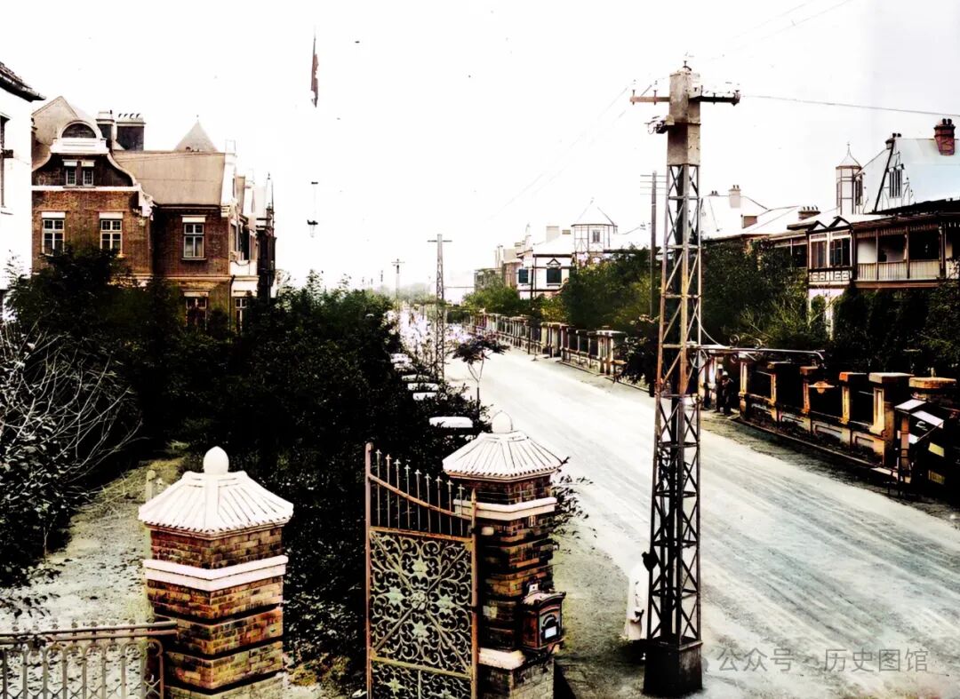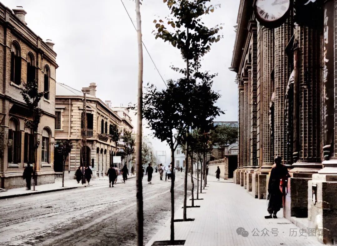 这是位于日本租界内的旭街。旭街,即现在的和平路。旭街和北旭街商业发达,照片左侧的圆顶建筑为加藤洋行。在这条街上还有中原公司。