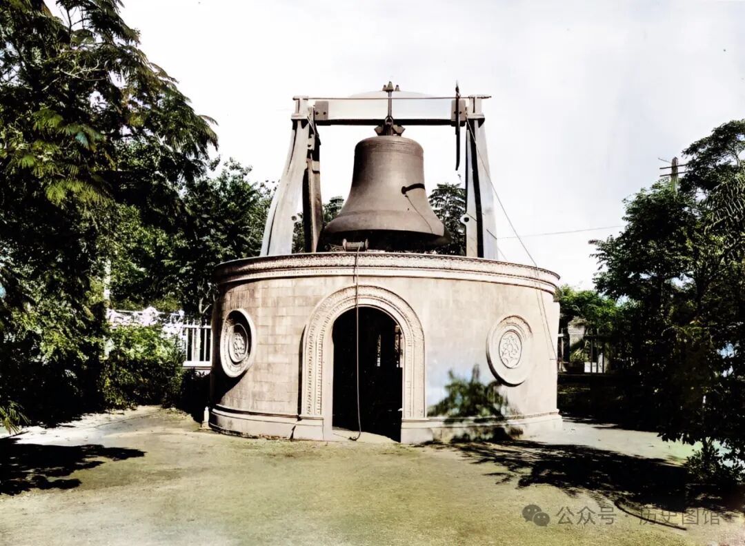 这是位于天津英租界维多利亚公园里的一口大铁钟。原为德国送清政府的礼物。该钟悬挂于海光寺。后来,日本人又将该钟送给英国工部局,作为消防钟悬挂于维多利亚公园内。再后来,英国工部局将该钟转送给南开大学。在原址又建起一座5米高的欧洲战胜纪念碑。
