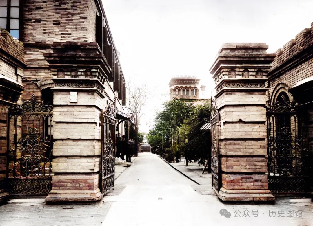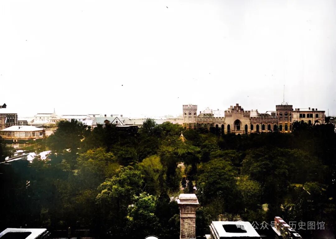 这张照片拍摄于天津英国租界。远处的欧式建筑是“戈登堂”,戈登堂前面是维多利亚公园。公园内绿树成荫。公园设计采用传统的英国风格,公园中心位置,还建了一座中式凉亭。公园四个角有门,但是不准中国人进入。