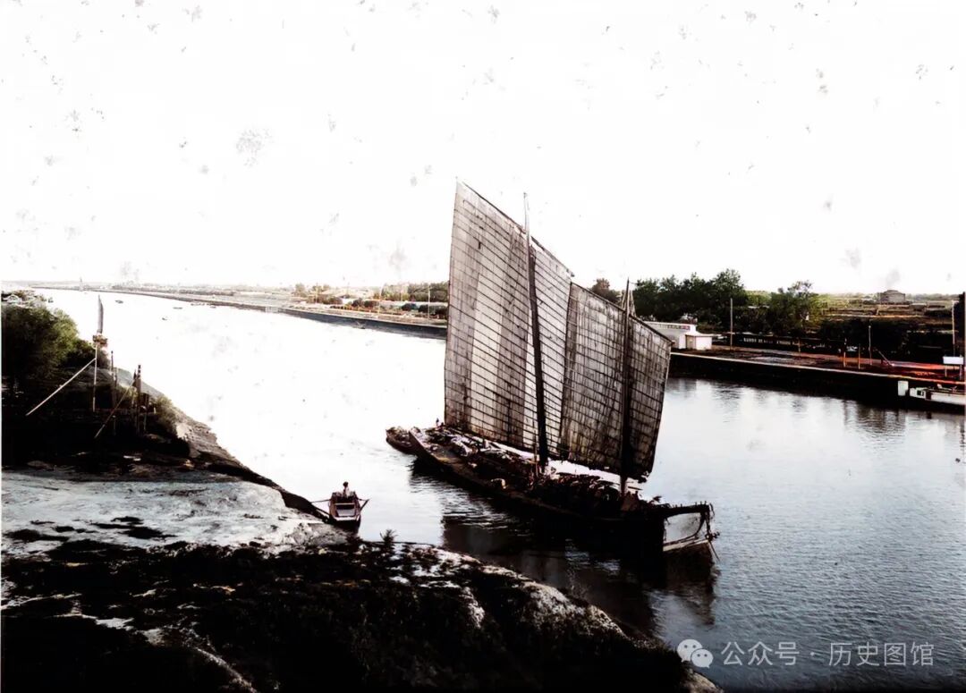 这张照片,拍摄于德国租界内。白河上,一艘大型帆船正在驶往下游。白河两岸,依稀能看到德国建筑。