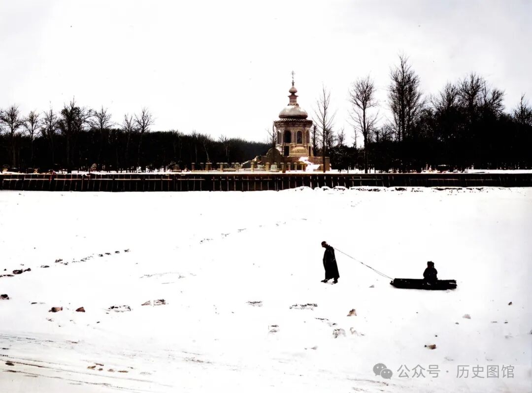 冬季的白河,结了厚厚的冰。一名男子用绳子拉着小木船,船上坐着他的孩子,两人在雪地里玩耍。远处,俄国修建的圆顶纪念碑建筑清晰可见。
