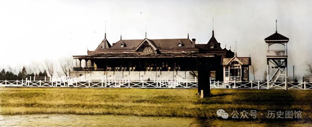 这是位于天津德国租界内的赛马场。这座赛马场规模很大,有巨大的看台和标准的赛马场地,能容纳上千观众。每年的春秋两季,这里都会举行盛大的赛马大会。马场道也因此得名,如今赛马场已不复存在。