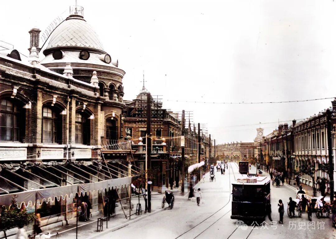 街道上,能看到有轨电车停靠在站点,乘客们正在上车。远处,一栋两层灰色建筑上有钟楼,四面都有钟表。俗称“四面钟”。一度成为天津的地标性建筑。