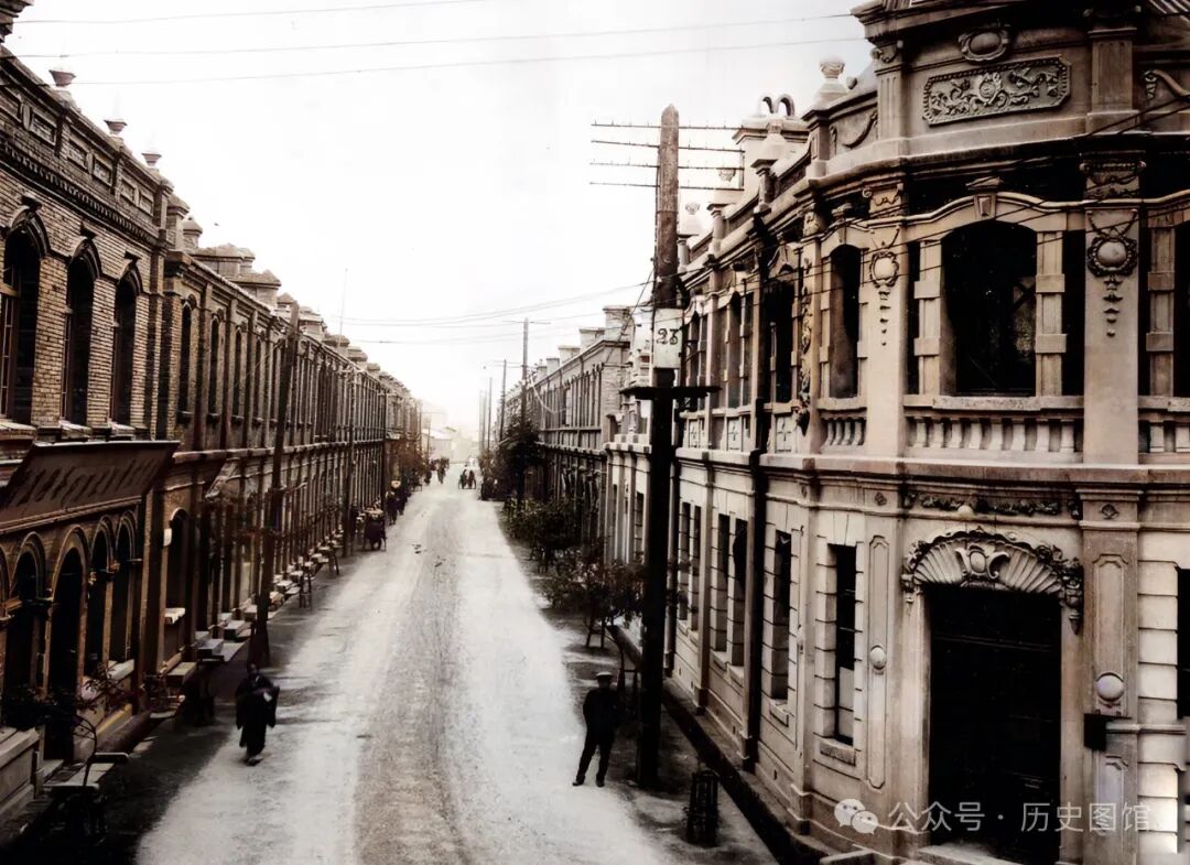 这张照片拍摄于天津法租界,这是租界内的一条主干道。街道两侧的建筑具有明显的法式风格。在这条街道上,有乌利文洋行、大清邮便局等。