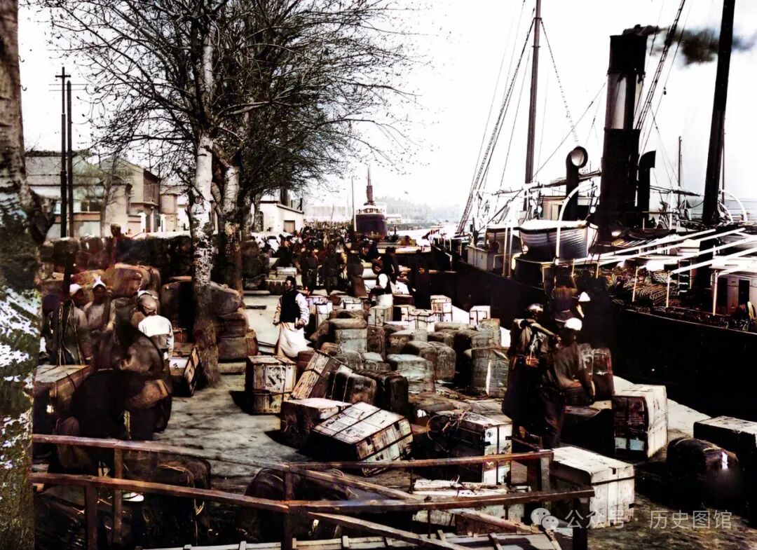 岸上堆放着整箱整箱等待装船的货物。一些码头工人抬着沉重的货物,码头上到处是繁忙的景象。昔日的天津白河港口,货物吞吐量惊人。