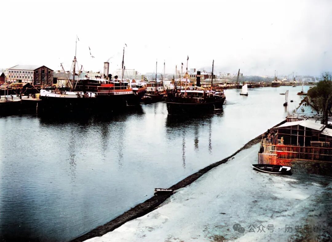 这是天津白河畔法租界内景象。码头边上,停泊着几艘大型货轮,烟囱里冒着黑烟。