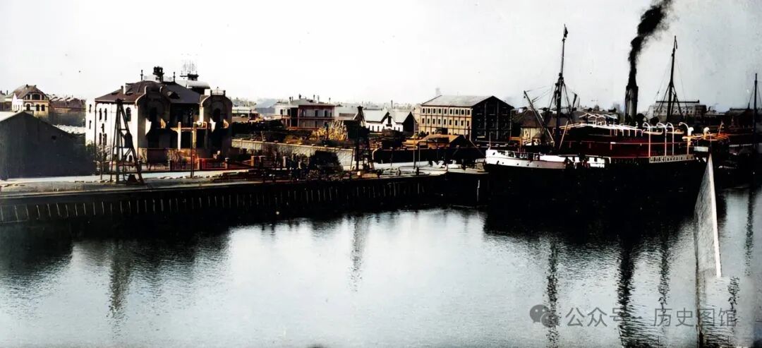 这张照片也是拍摄于天津德国租界。白河岸边,一座码头边上,停靠着一艘大型轮船,烟囱里冒出黑色的浓烟。岸上有一些欧式建筑。