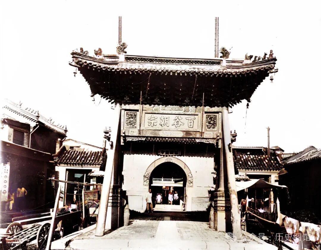 清朝末年,天津天后宫景象。山门内,一座两柱一楼式木牌坊,斗拱飞檐,雕梁画栋。牌坊上匾额金字为“百谷朝宗”,百谷指所有河流,意思妈祖掌管天下所有江河。一座天后宫,凝聚和抚慰着天津海河两岸众人的心灵。