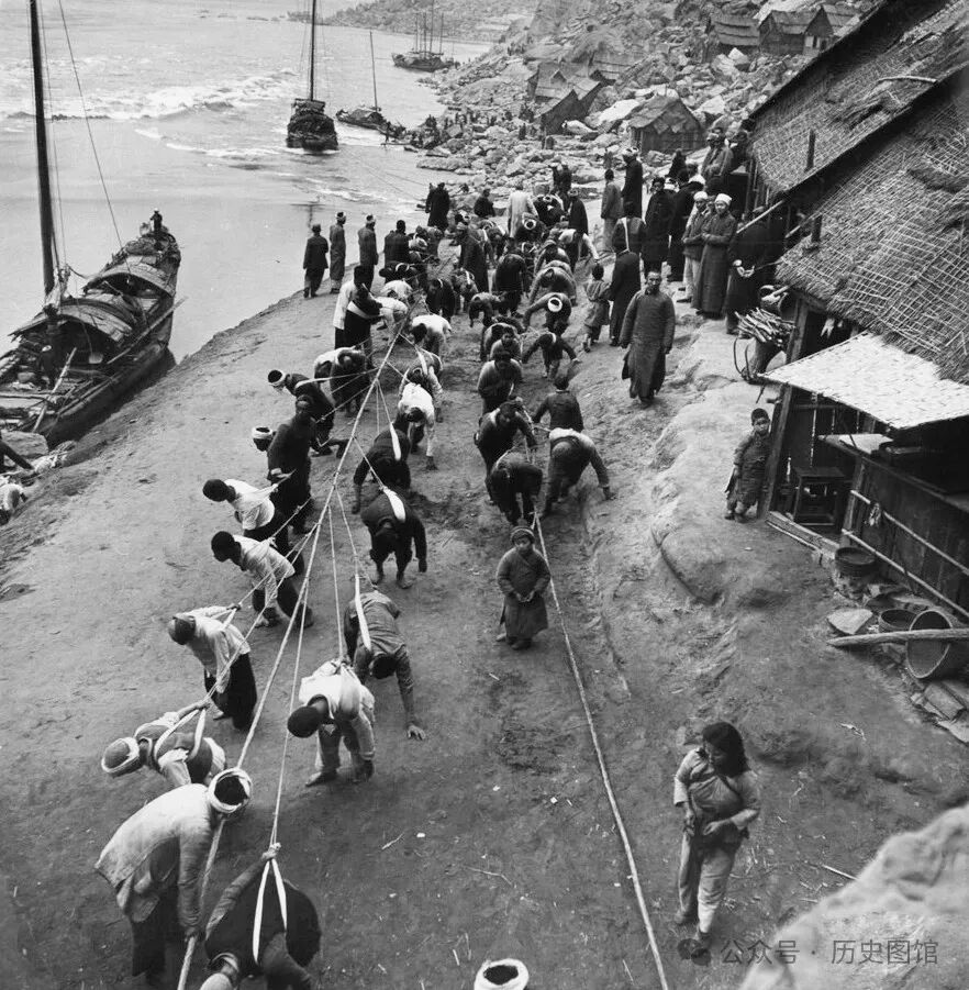 在这张照片里,几十名纤夫正拉着一艘船逆水而上。他们手脚并用,身体与地面呈九十度,几乎是用爬的方式在缓慢前进。考验的是船工、舵手和拉纤团队的协作能力。看到这张照片,耳边似乎想起了高亢、激越的峡江号子,让人热血澎湃。