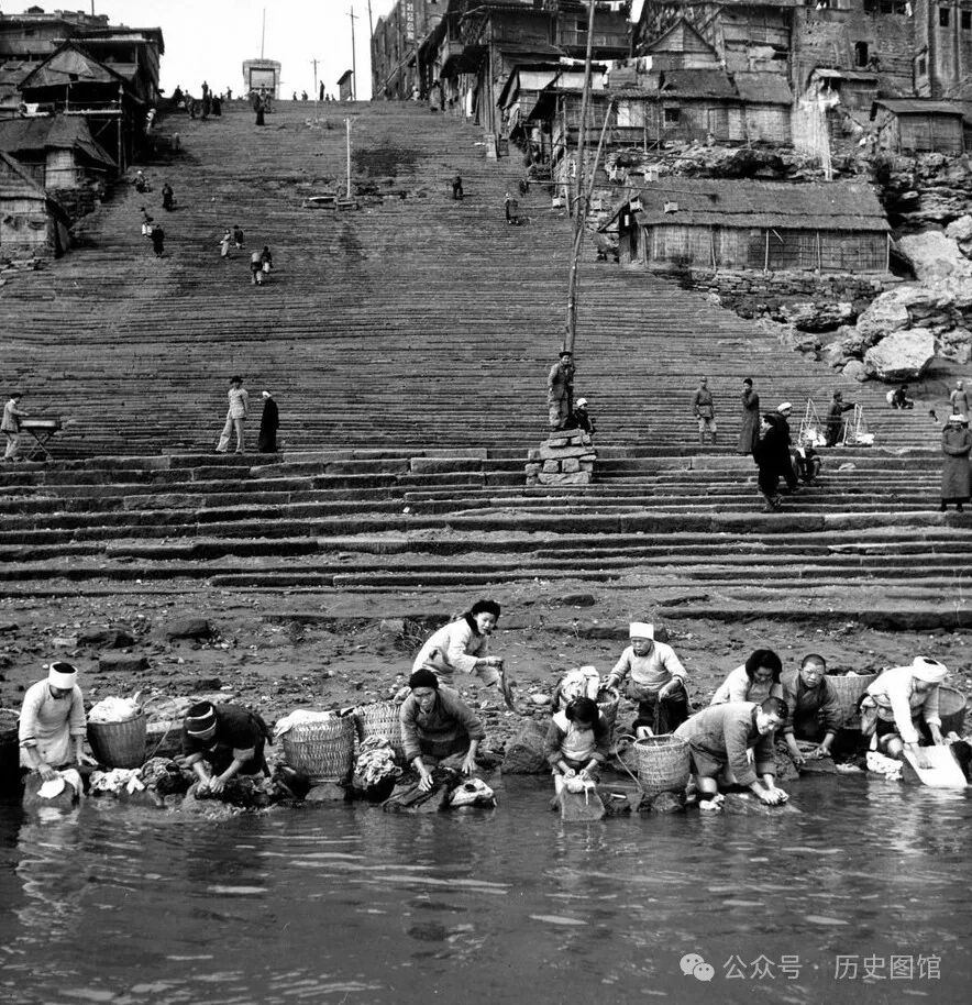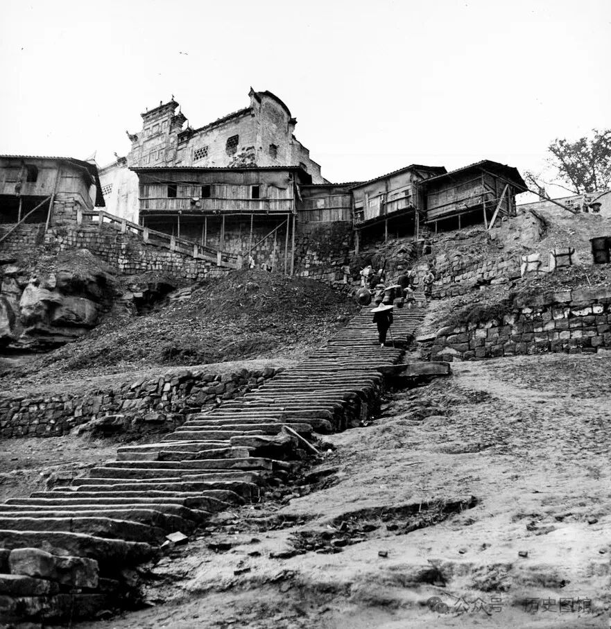 1946年,万县江边的一层层石梯。岸上的建筑古色古香,尤其是那一座座吊脚楼,依山靠河就势而建,处处体现着巴渝民居的独特风情。