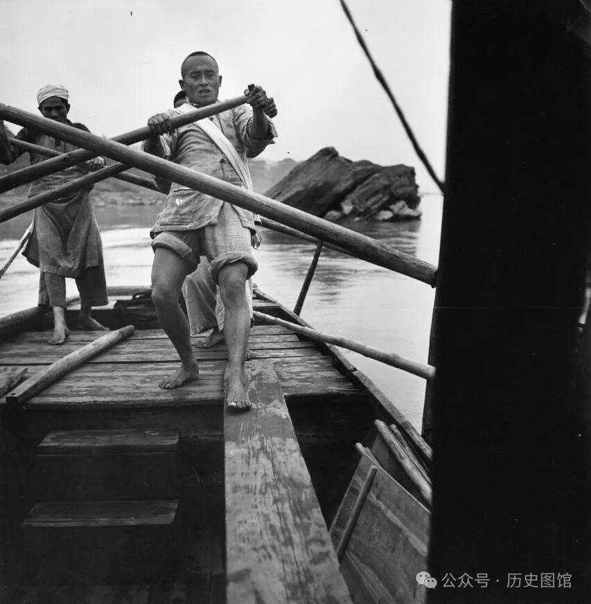 船上的几名水手正在用力划桨,坐在船舱里的米特里·凯塞尔,举起相机拍下了他们工作时的情景。俗话说小心驶得万年船,在三峡狭窄的江水中行船,水下情况十分复杂,水手们既要有体力,又要胆大心细。
