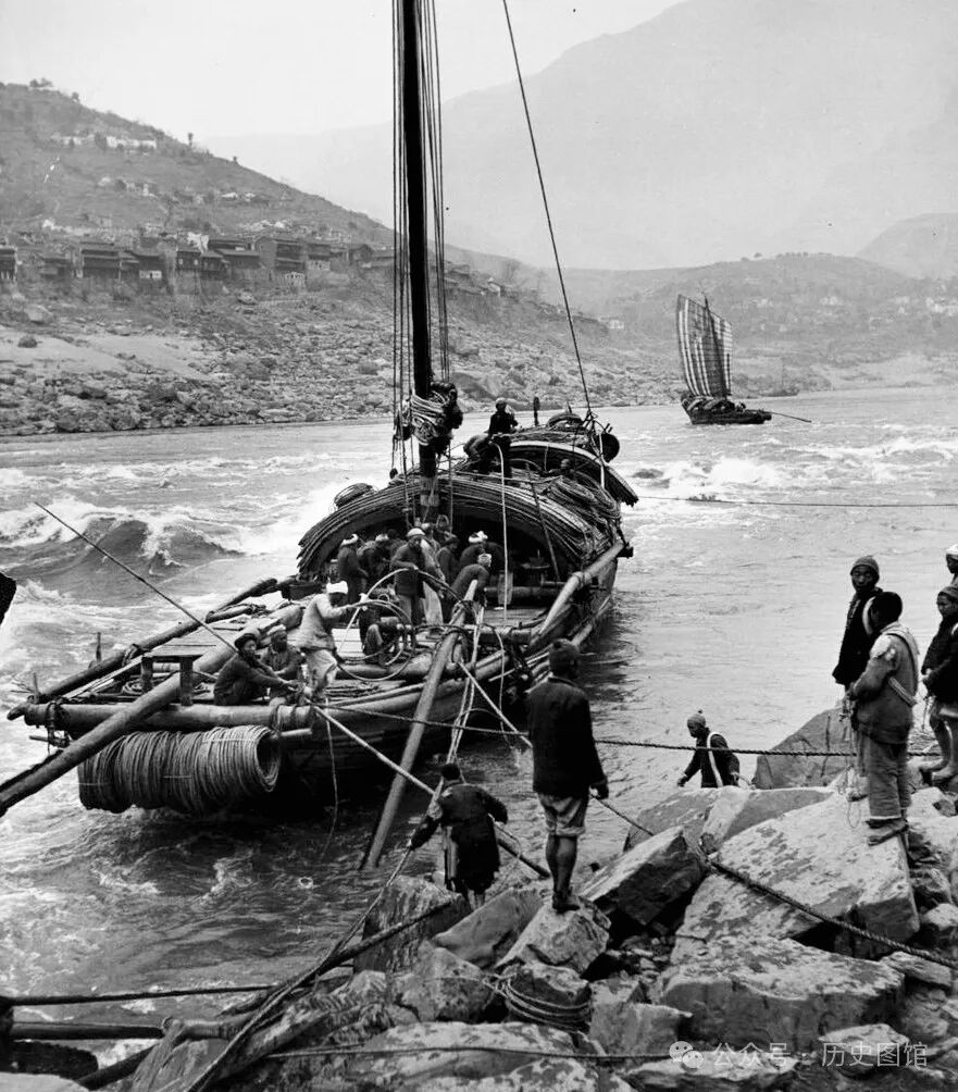 1946年,秭归新滩上滩,一艘大型帆船停靠在岸边,站在岸边礁石上的纤夫们正准备接纤。这里水流湍急,水下状况复杂,船只必须依靠纤夫拉着才能顺利通过。