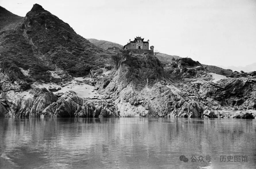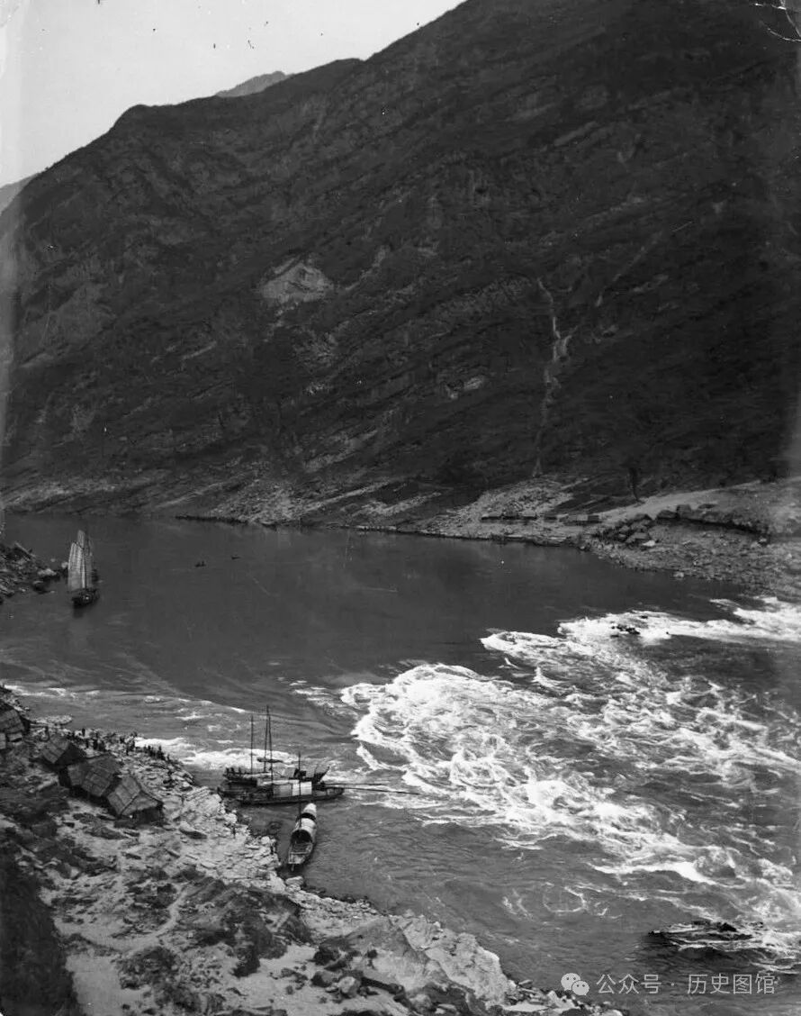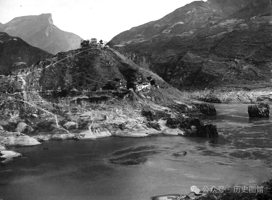 米特里·凯塞尔乘坐船只穿越巫峡。两座大山犹如敞开的巨门,江水从中间奔涌而出。仔细看,照片右侧的山上,是巴东官渡口龙王庙。
