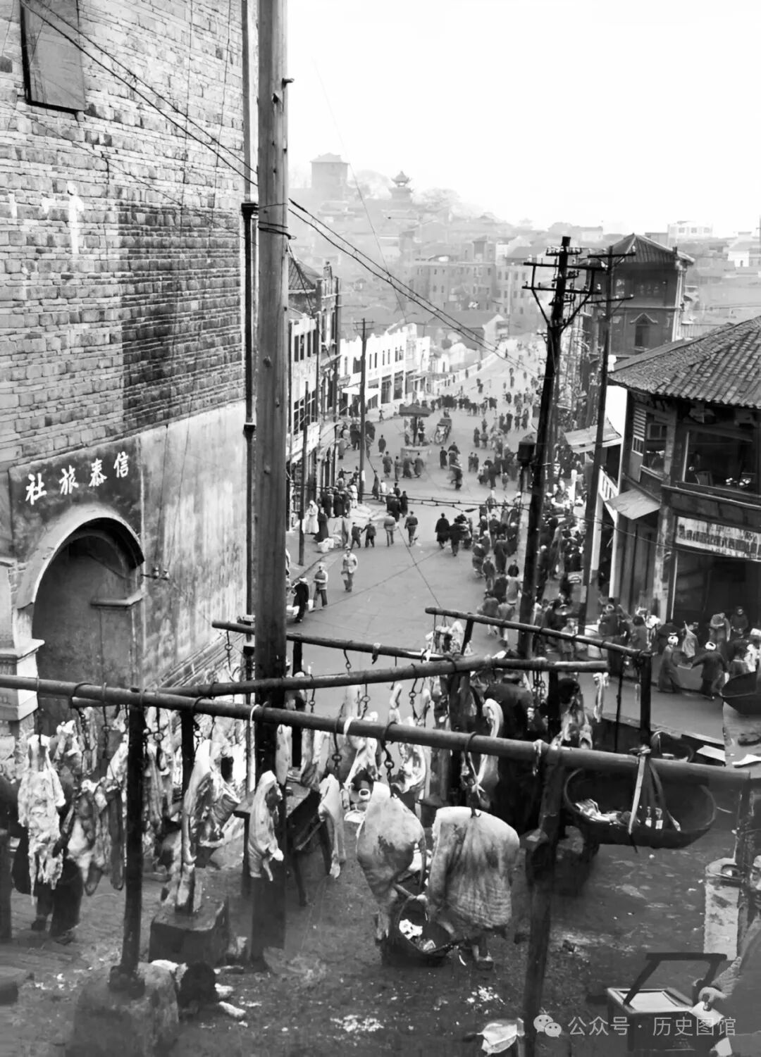 1946年,位于万县的万安路十字街口景象。照片中左侧建筑,门楣上方写着“信泰旅社”四个字,旅社门口是一个菜市场,立着很多肉架。远处的大街上,人群熙熙攘攘,十分热闹。