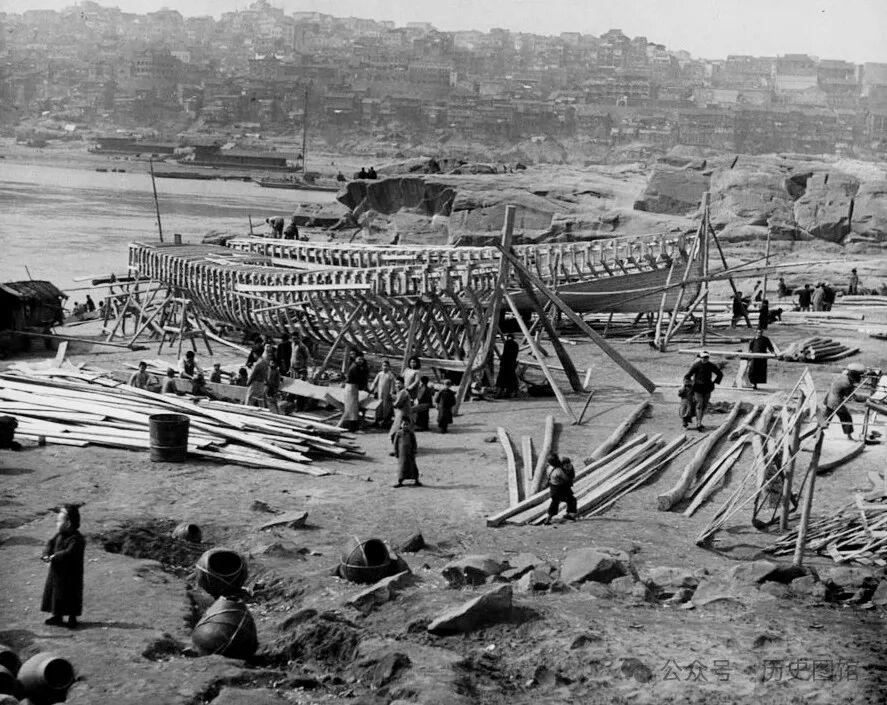 自古以来,长江航运业发达。这是位于江边的一处露天造船厂。造船工人们,在地面上搭建起的船只的木龙骨,船只的雏形已可见。可以想象,要不了多久,这两艘大船就能下水扬帆远航了。