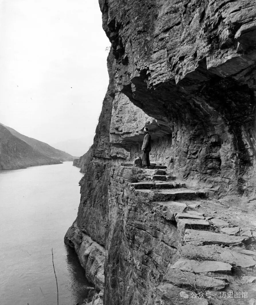 摄影师米特里·凯塞尔不仅乘坐飞机航拍,他还亲自登上位于瞿塘峡北岸陡峭崖壁上的古栈道。照片中,一名当地向导站在栈道的台阶上,下面就是直立的崖壁和江水。