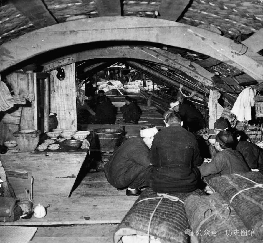 1946年,江边一艘大船上,船家一家人正围坐在桌前吃饭。看船舱内的陈设,有灶台、锅