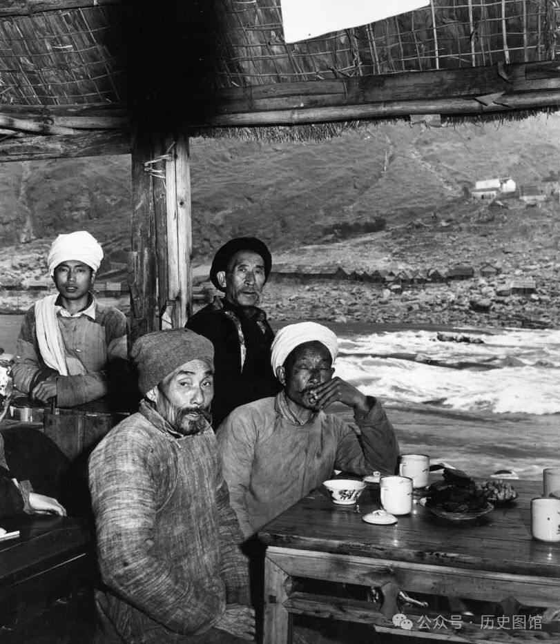 在秭归新滩的南岸,江堤上有专门为纤夫们休息而搭建的棚子。棚子下面放有桌子板凳,水手们可以在这里休息喝茶。米特里·凯塞尔为他们拍下了这张照片。