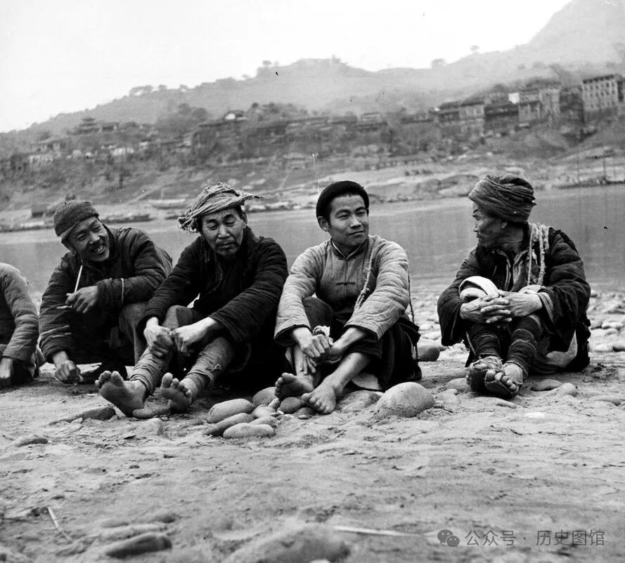 40年代,当地几名纤夫正坐在江边休息。在他们身后的江对岸,是万县北山街。一栋栋建筑鳞次栉比,远处青山连绵不绝。