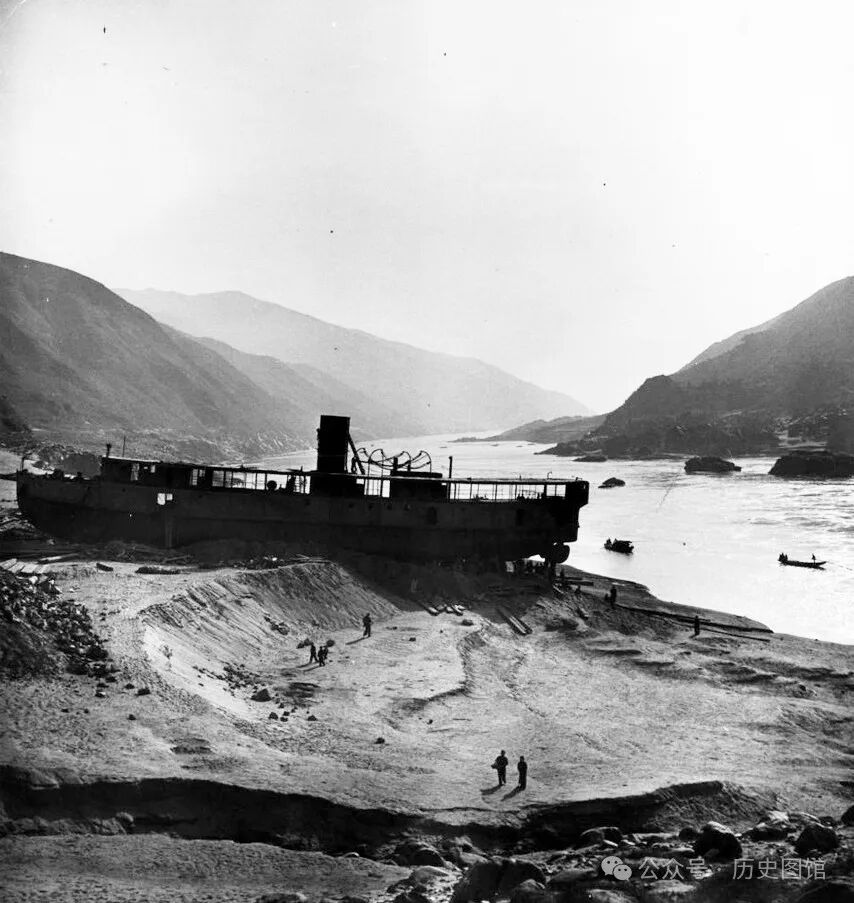 1946年,位于三峡的一处江堤上,有一艘发生故障的汽船。江水退却,大船被搁浅在了岸上上。维修工人们正在修复这艘船。等到江水涨潮,修理好的大船就能再次启航。