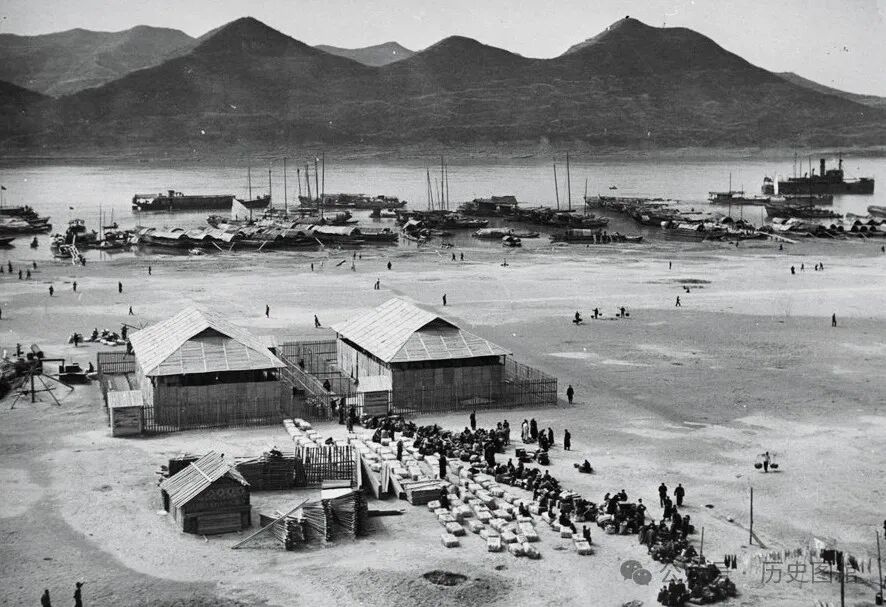 近处,几栋货栈仓库外面,堆放着各种货物。江边码头上,停泊着大大小小各种船只。照片中景象,只是这个大型货栈码头的局部。远处,江面烟波浩渺,山峦起伏。
