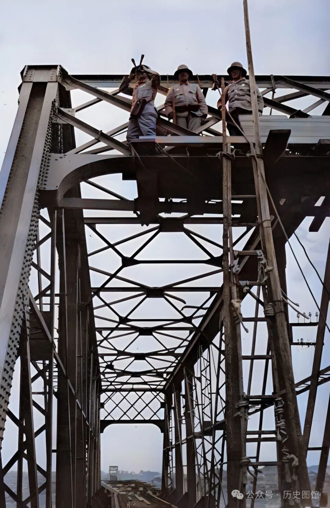 1938年4月,几名日军站在一座铁路桥上,观察远处中国军队阵地上的情况。这座雄伟的大桥,是位于津浦线安徽蚌埠段的淮河铁桥。日军在大桥上搭起木梯,作为一个观测点。